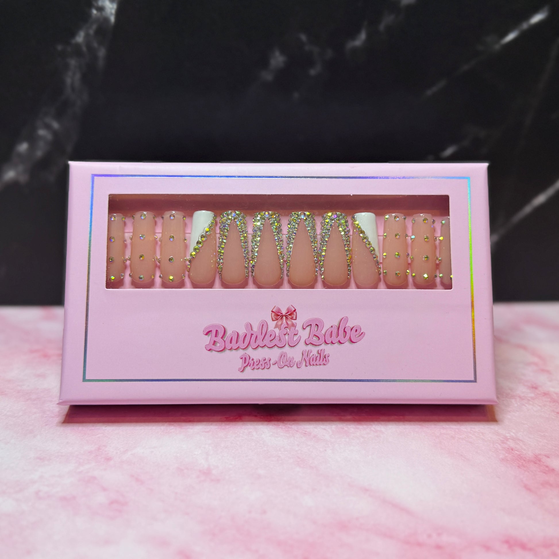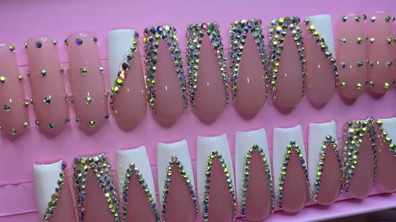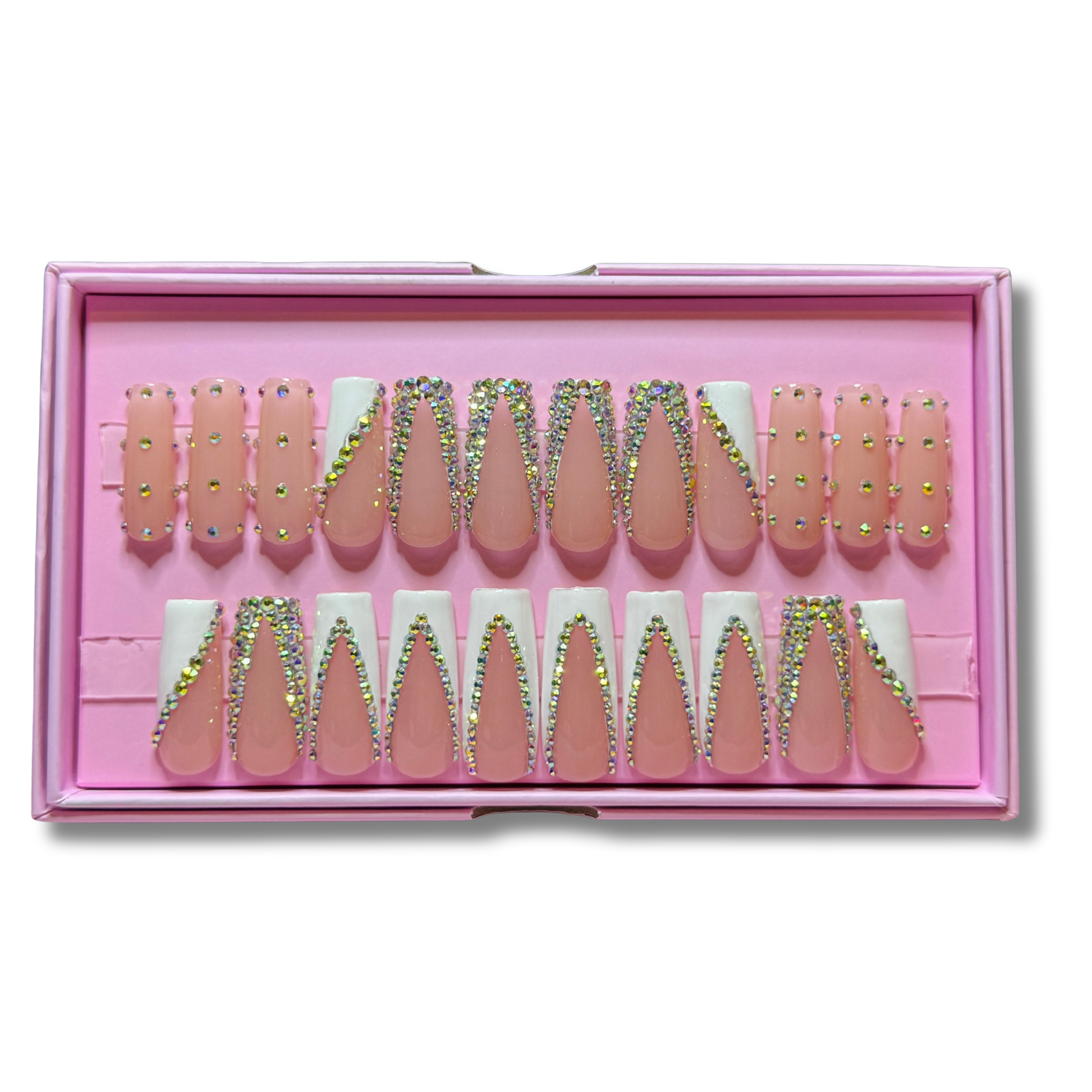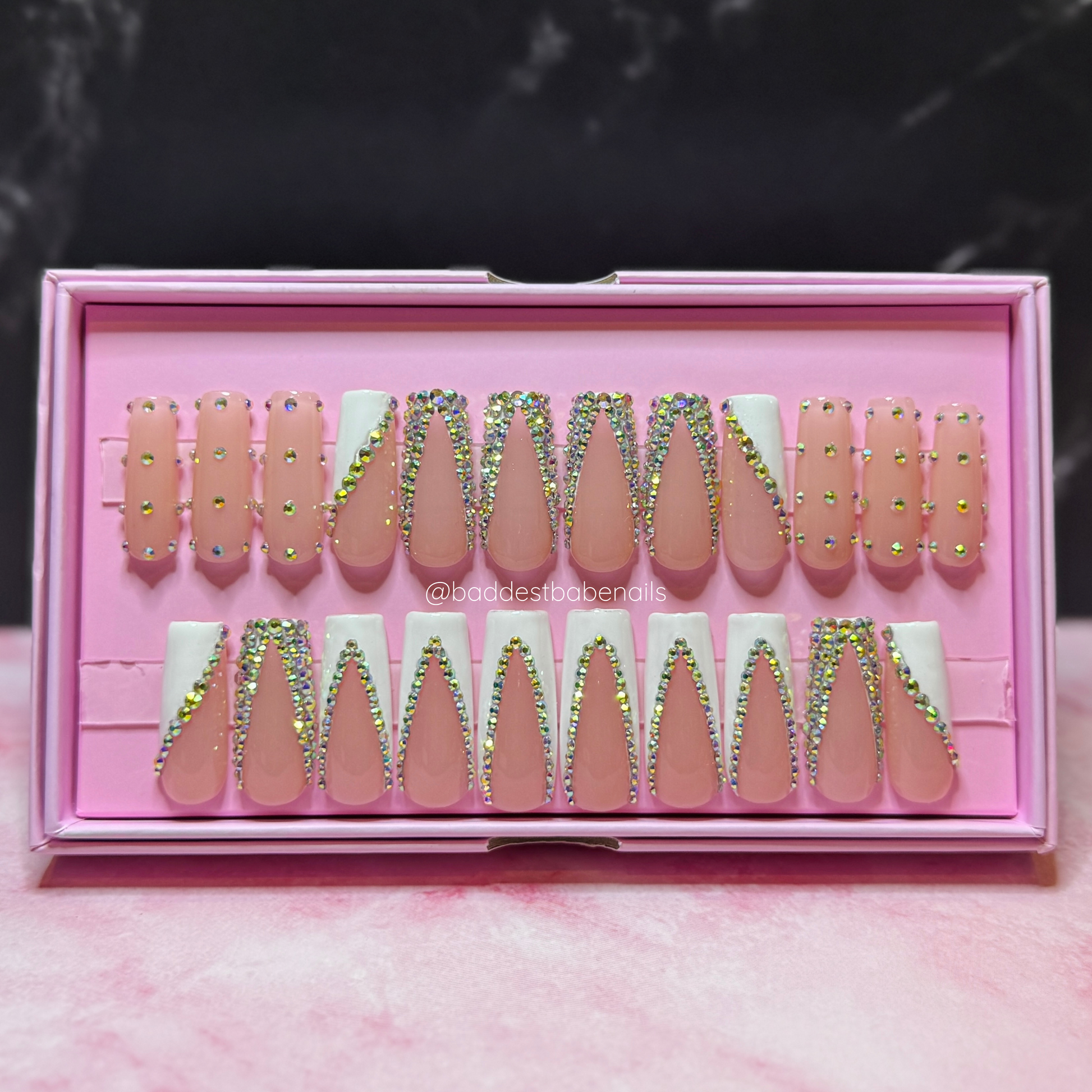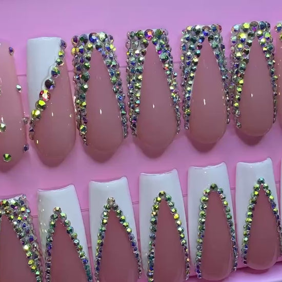 Ready to Wear Square/Long set with lots of AB rhinestones in various ss sizes, nude he’ll polish and white gel liner.