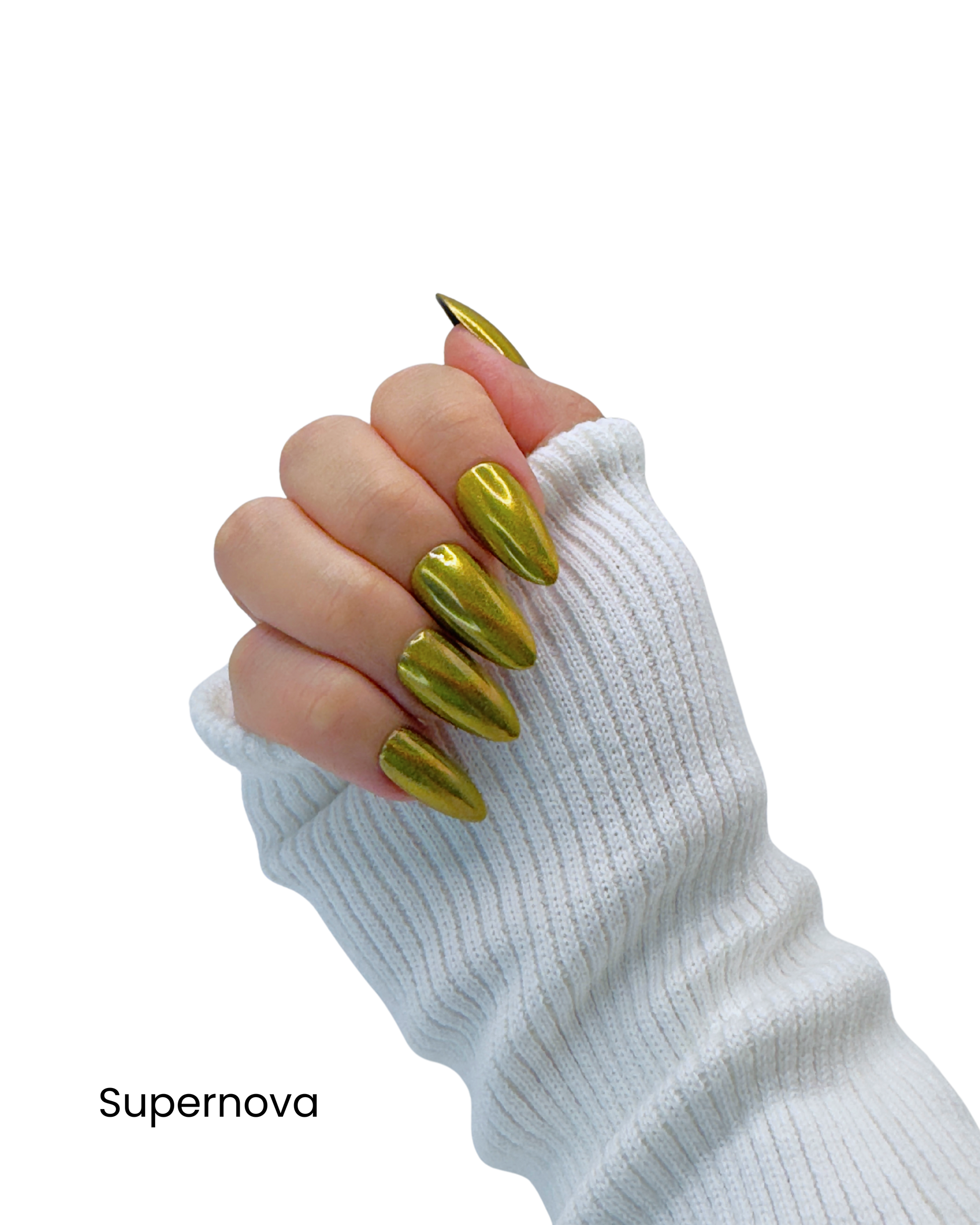 Channel pure Y2K fantasy with Vol. 1 – Holographic Dreams. Choose from Trinity (silver), Supernova (gold), or Pixel Princess (pink) — futuristic chromes that shimmer from every angle. Available in any shape and length.
