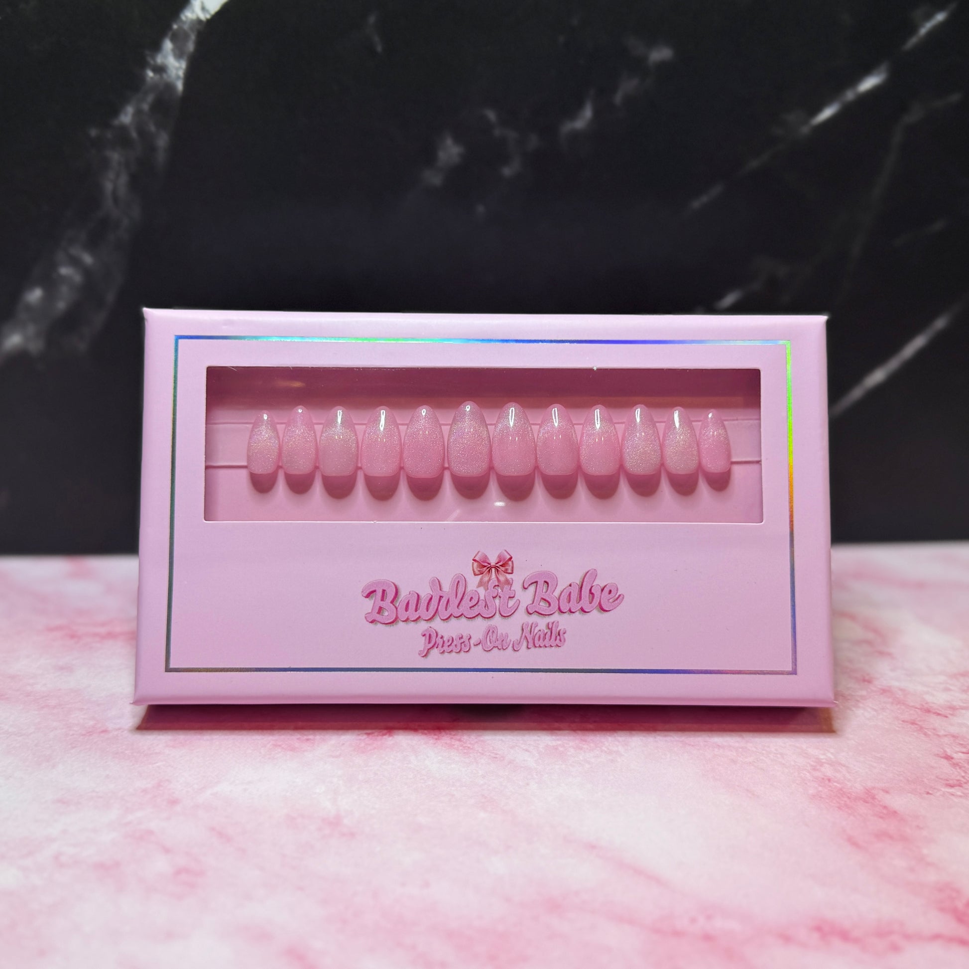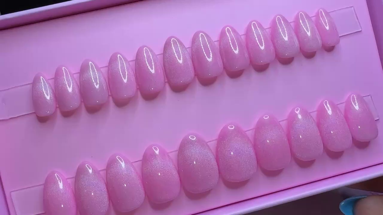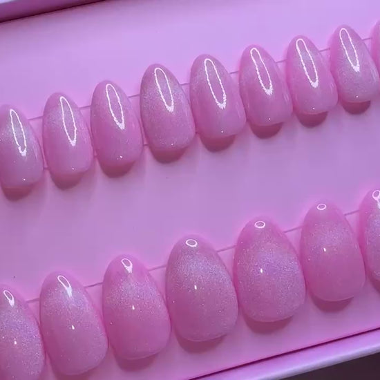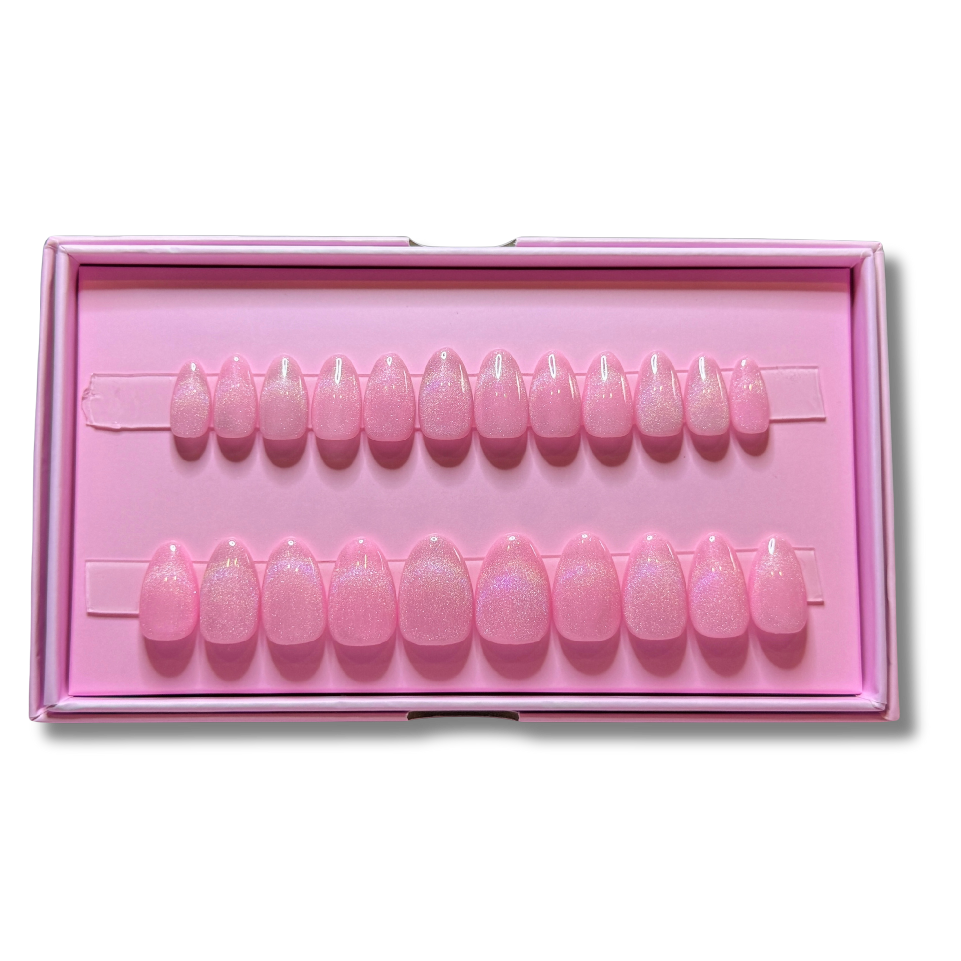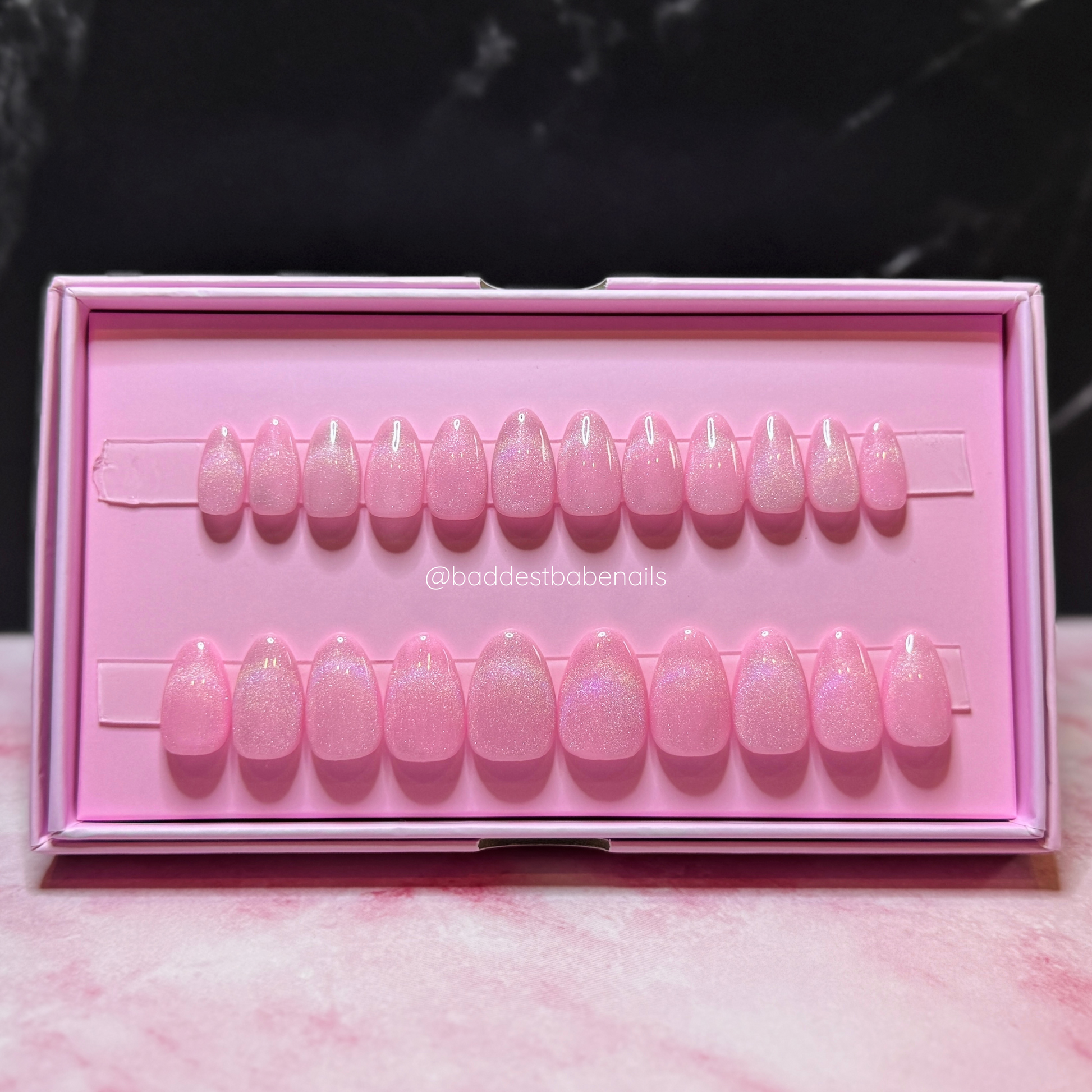 Ready to Wear Almond/Short set in light pink gel polish under holographic cateye.