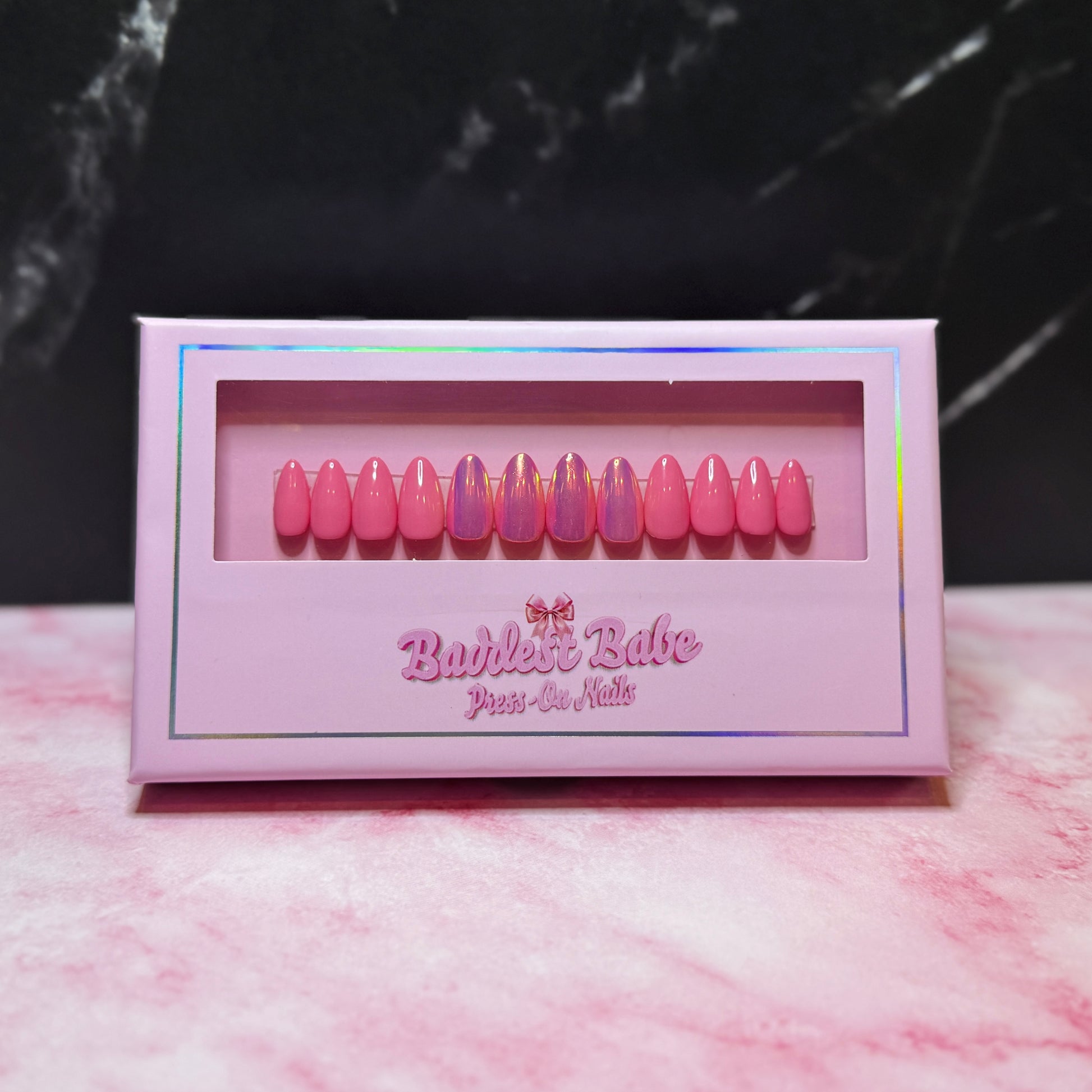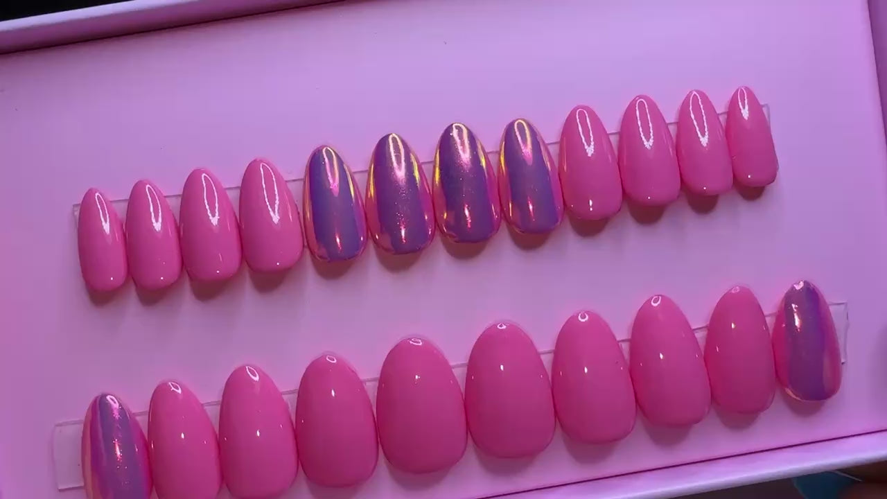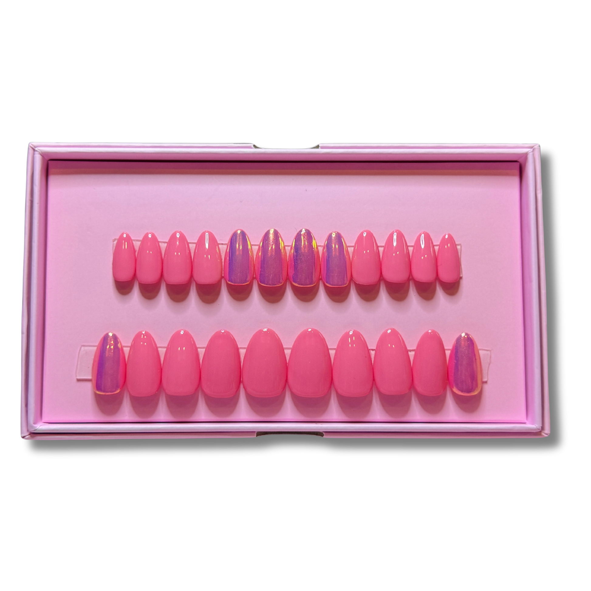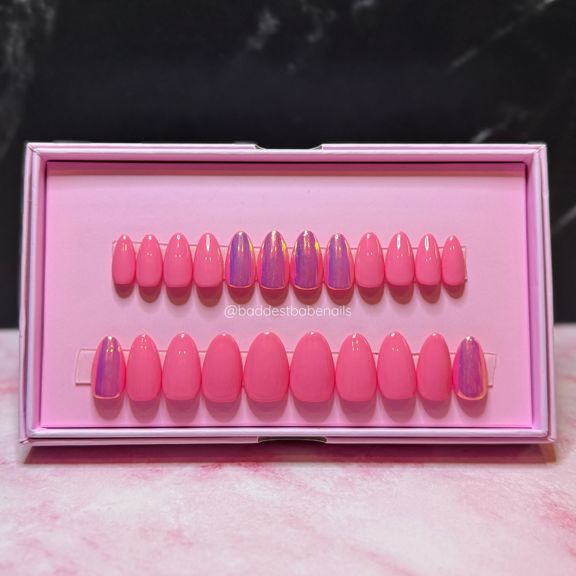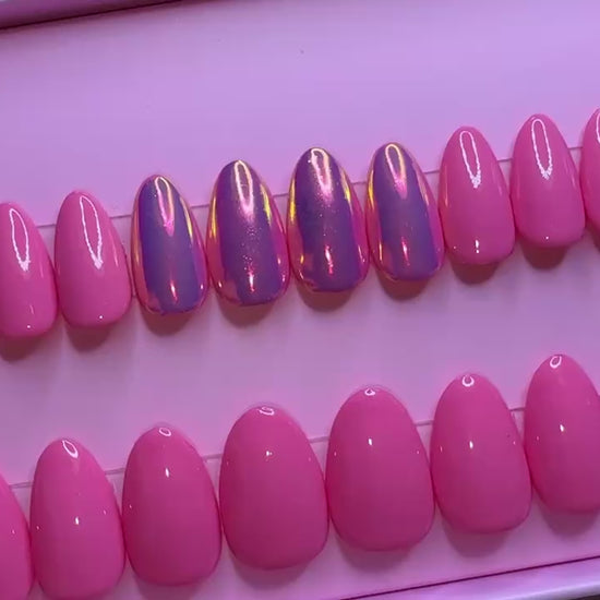 Ready to Wear Almond/Short set in a warm strawberry pink gel polish and neon pink chrome.