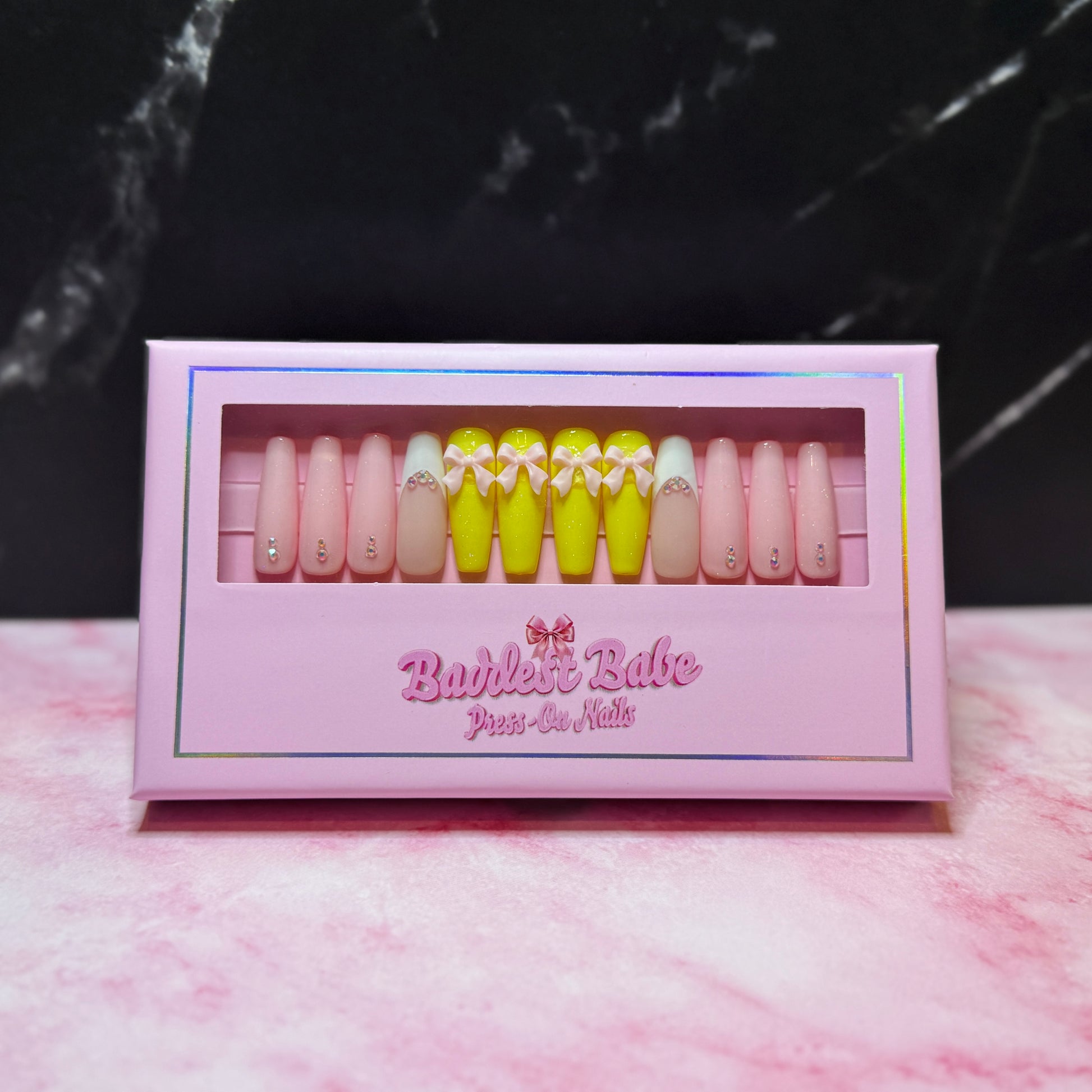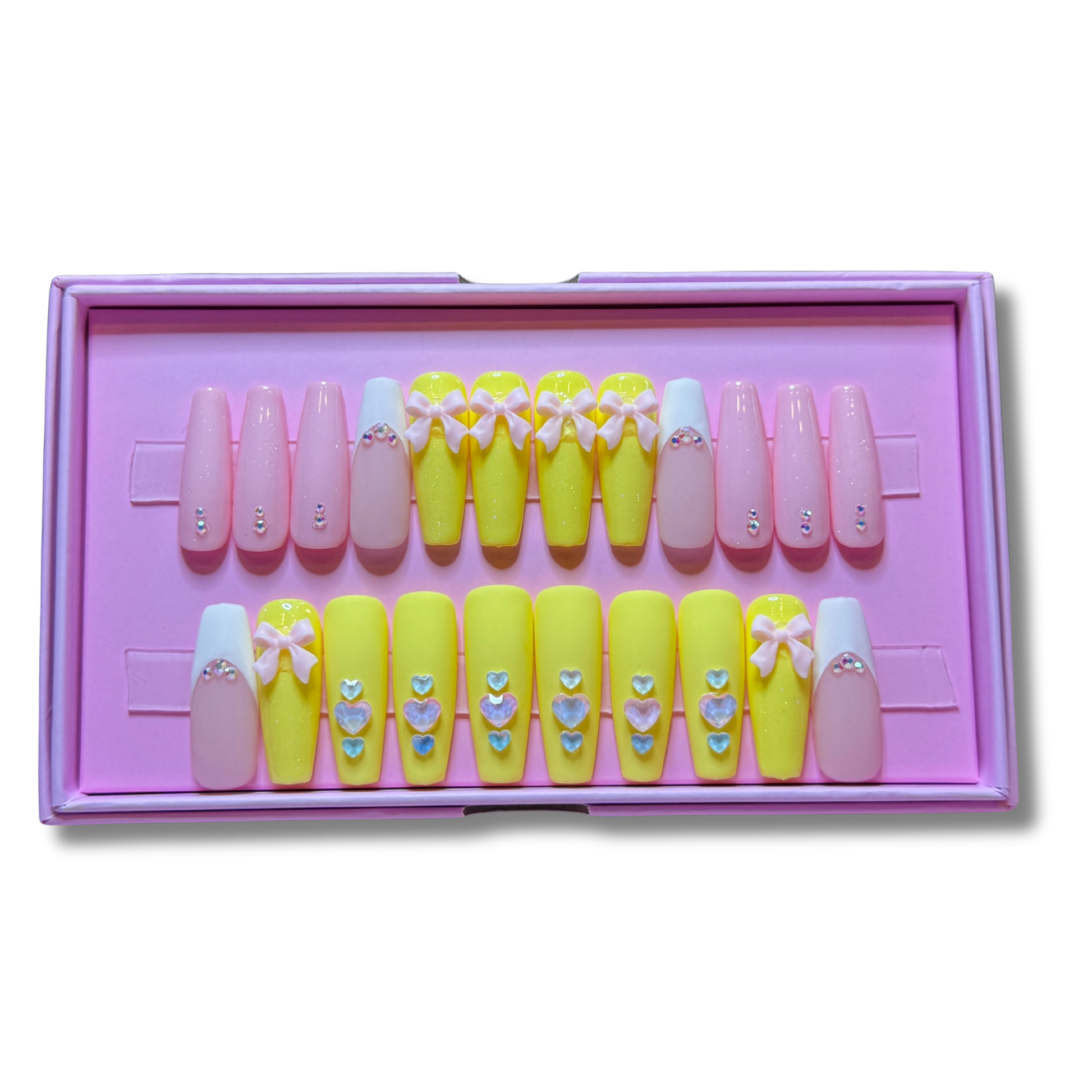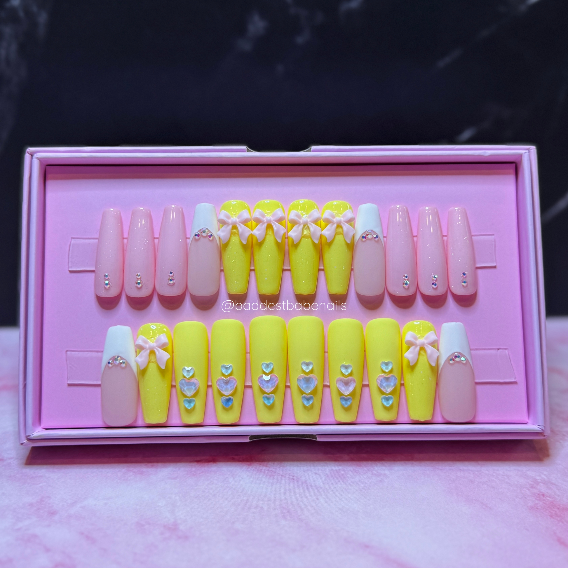 Ready to Wear Coffin/Long set in neon pastel yellow & pinky nude feel polish, frenchies, unfoiled AB rhinestones, pastel heart shaped rhinestones, clear holographic glitter and light pink bow charms.