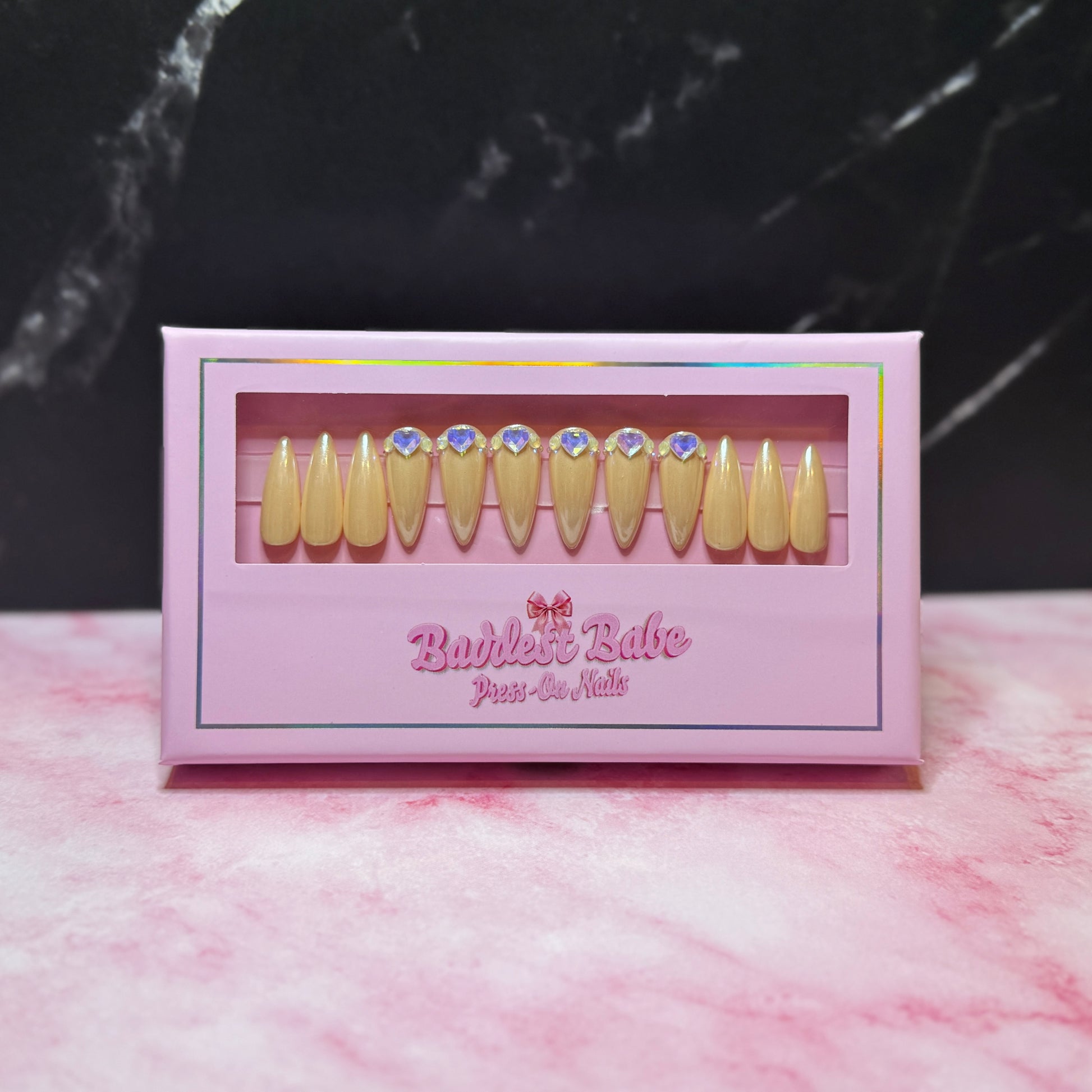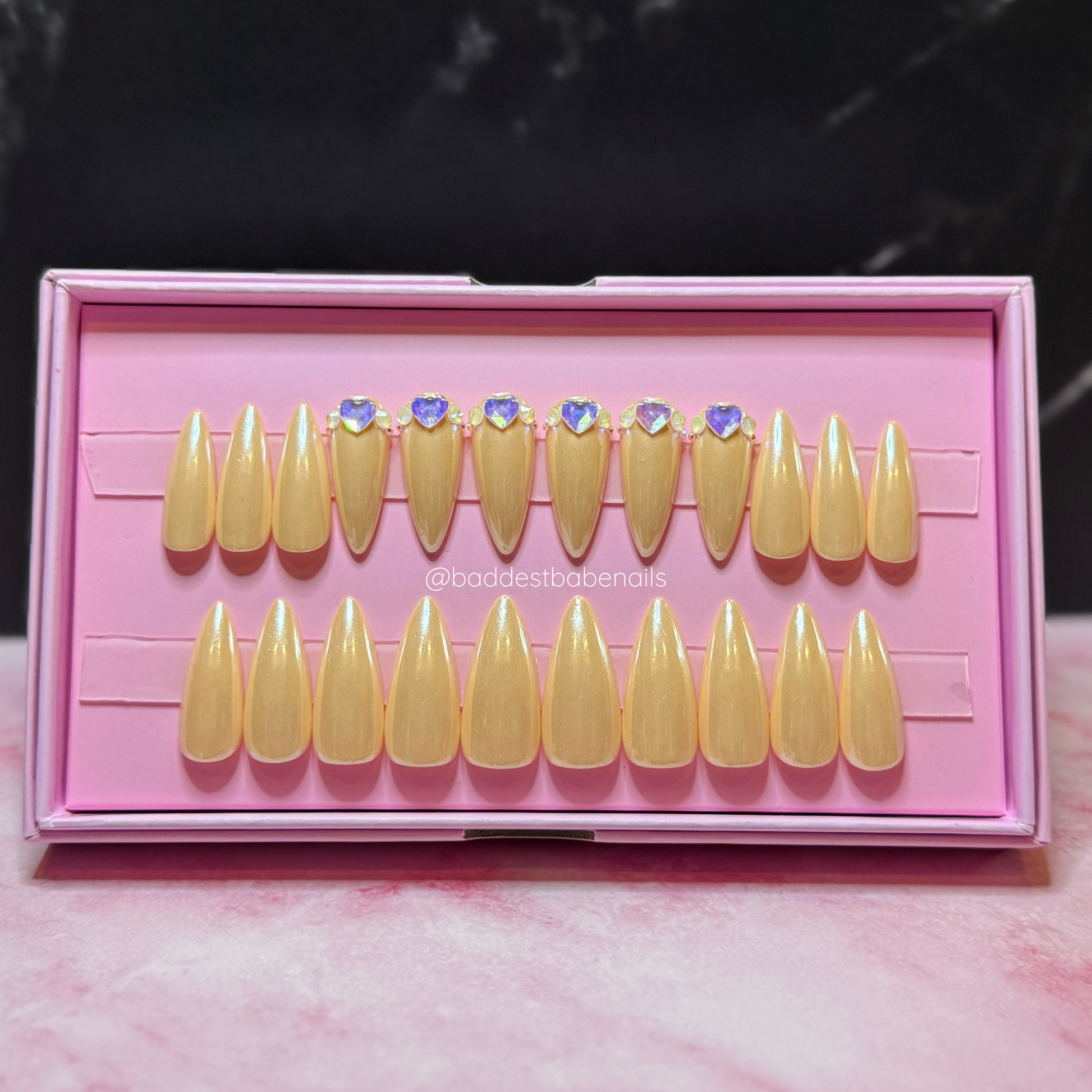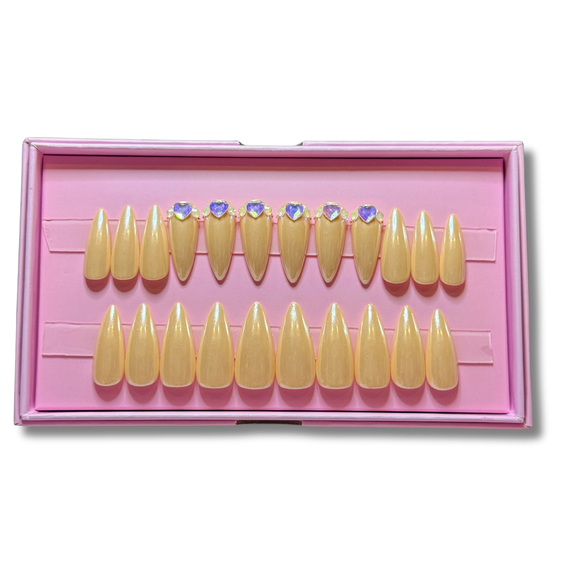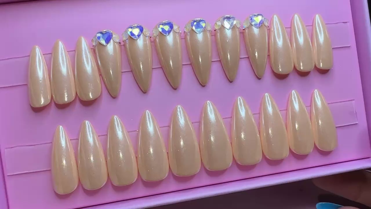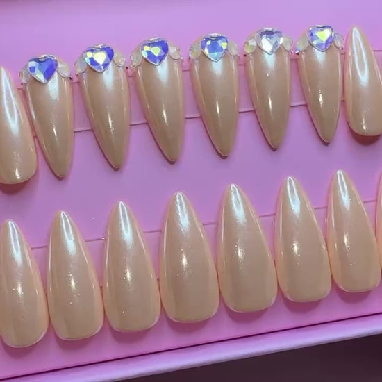 Ready to Wear Stiletto/Medium set in a warm, light pink-orange gel polish under a white chrome and heart shaped rhinestones.