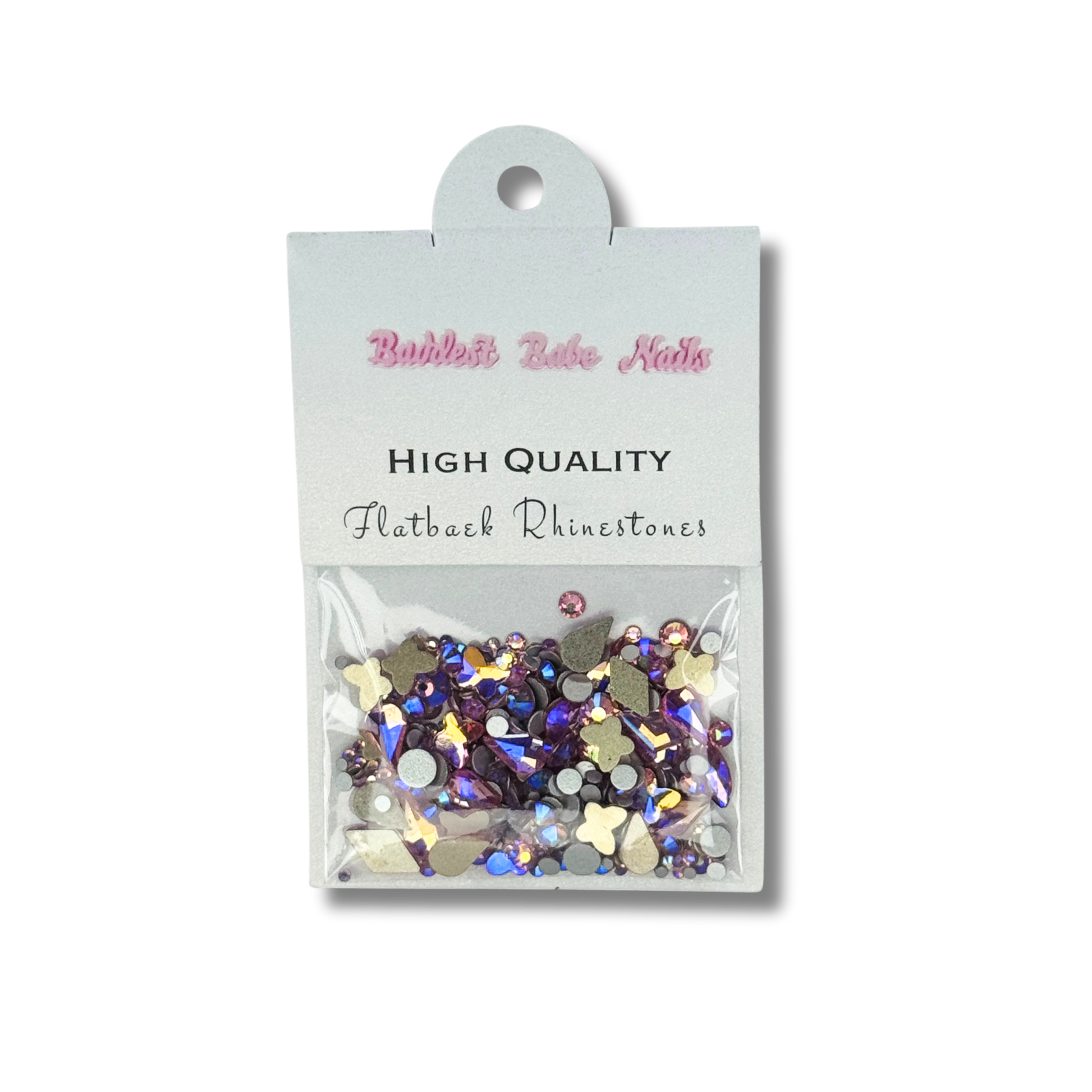 Elevate your manicures with our collection of ultra-sparkly glass rhinestones. These rhinestones deliver exceptional brilliance at an accessible price point. The Baddest Babe Nails Flatback Rhinestone Mix features a diverse range of shapes, perfect for adding sparkle to any nail design.