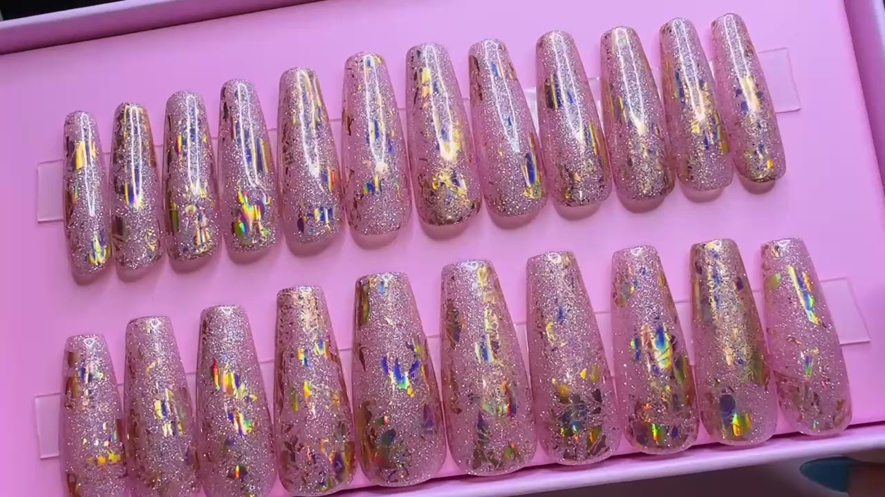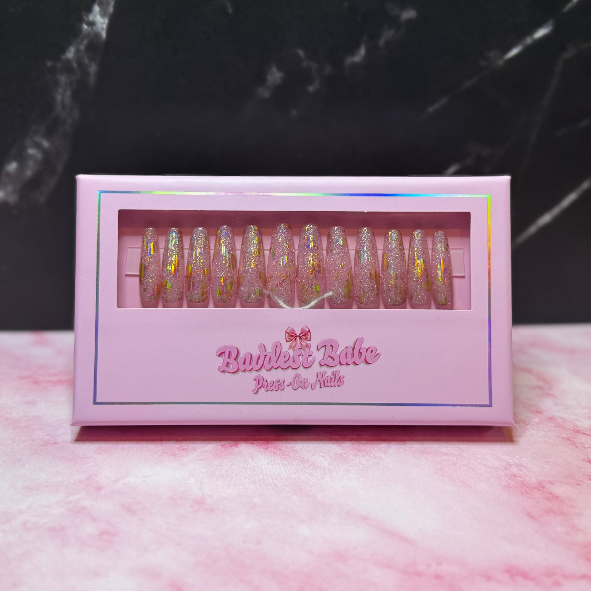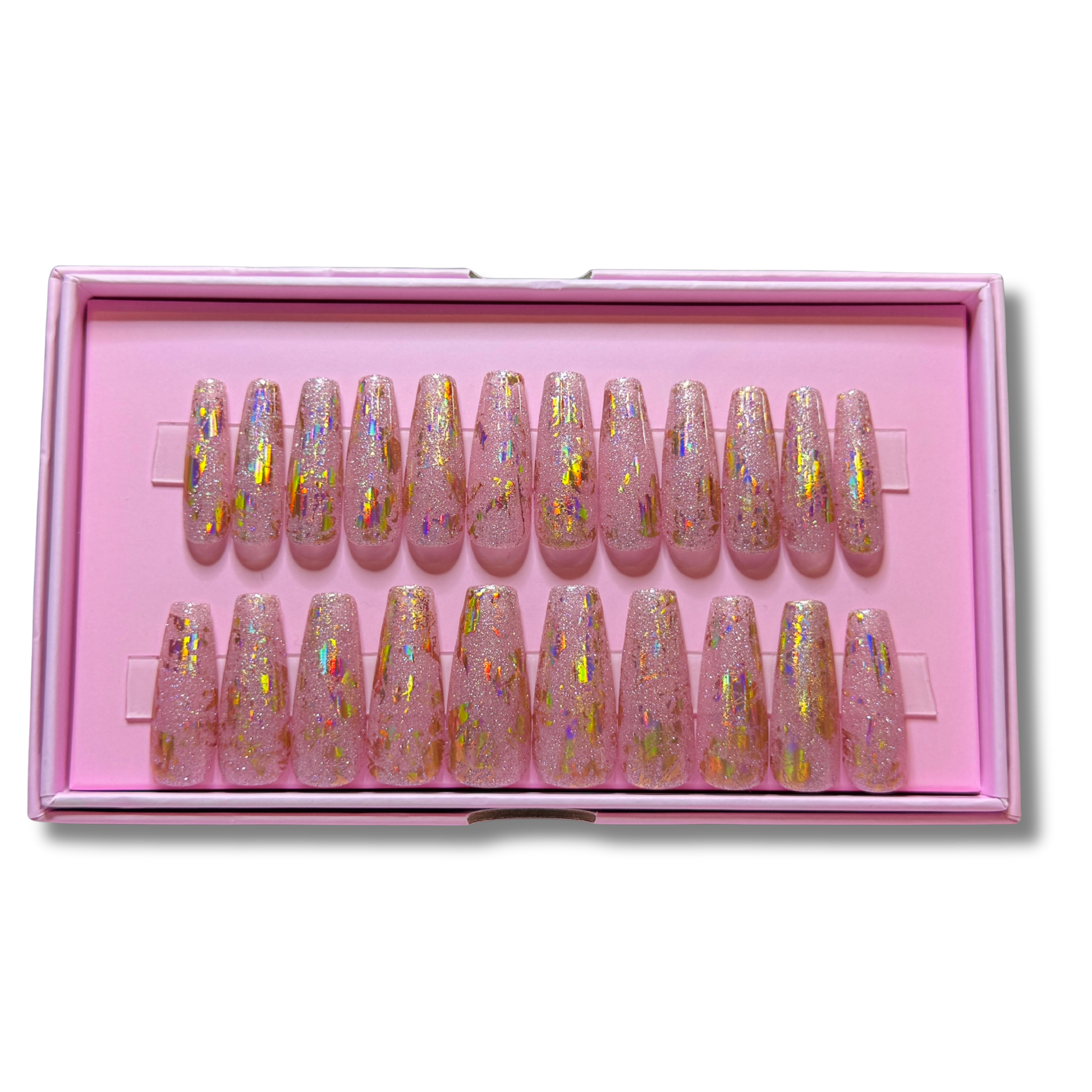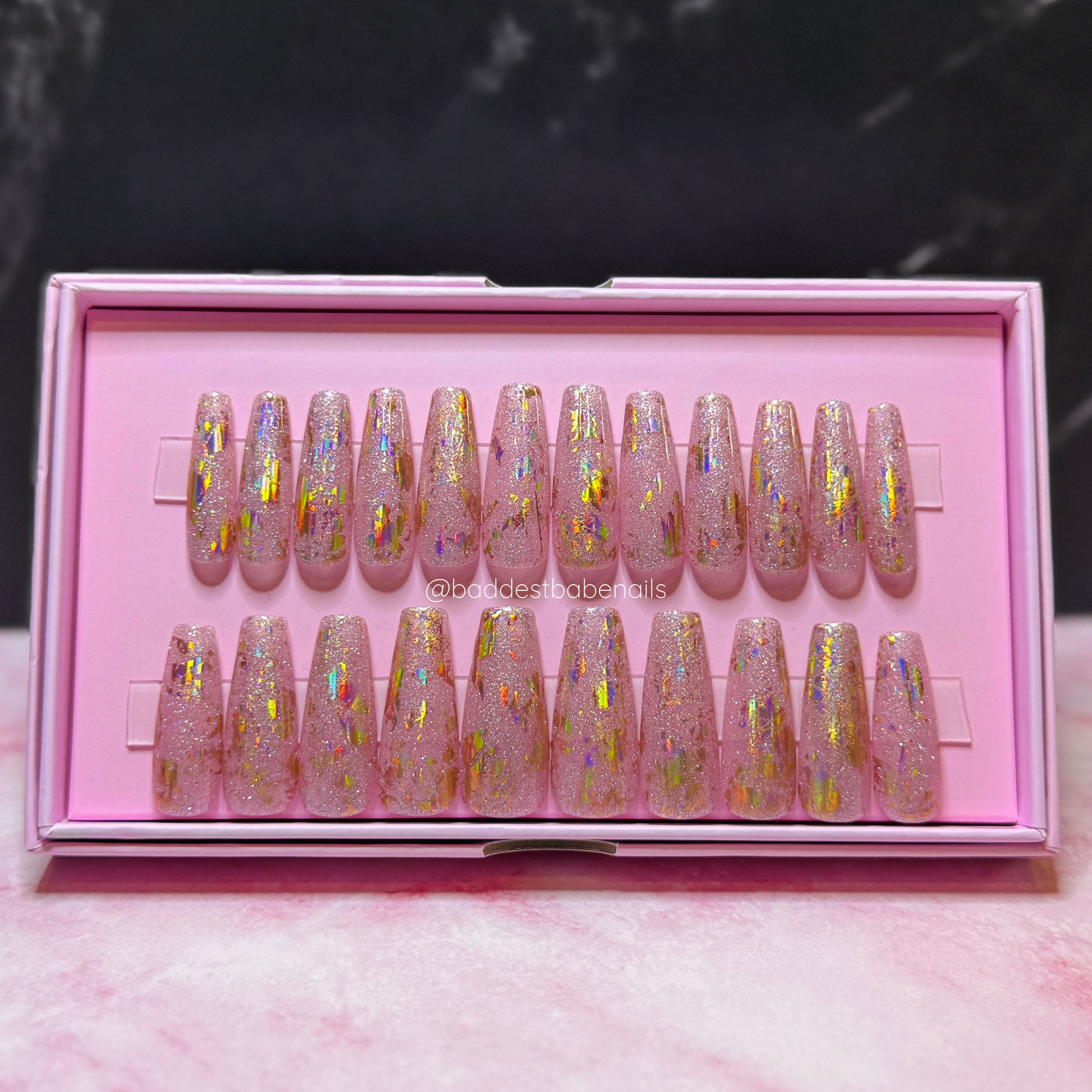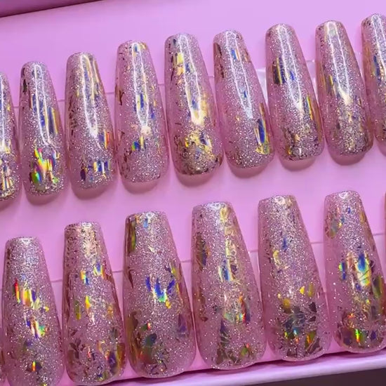 Ready to Wear Coffin/Long set in a pastel pink gel polish, jam packed with reflective, iridescent and holographic sparkles. With pieces of gold holographic foil.