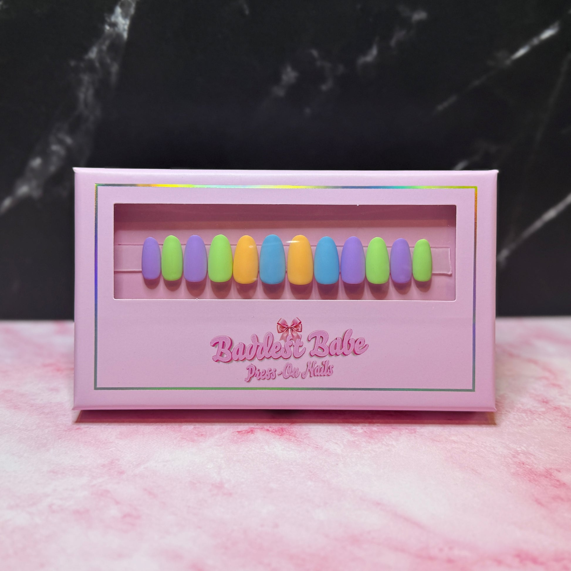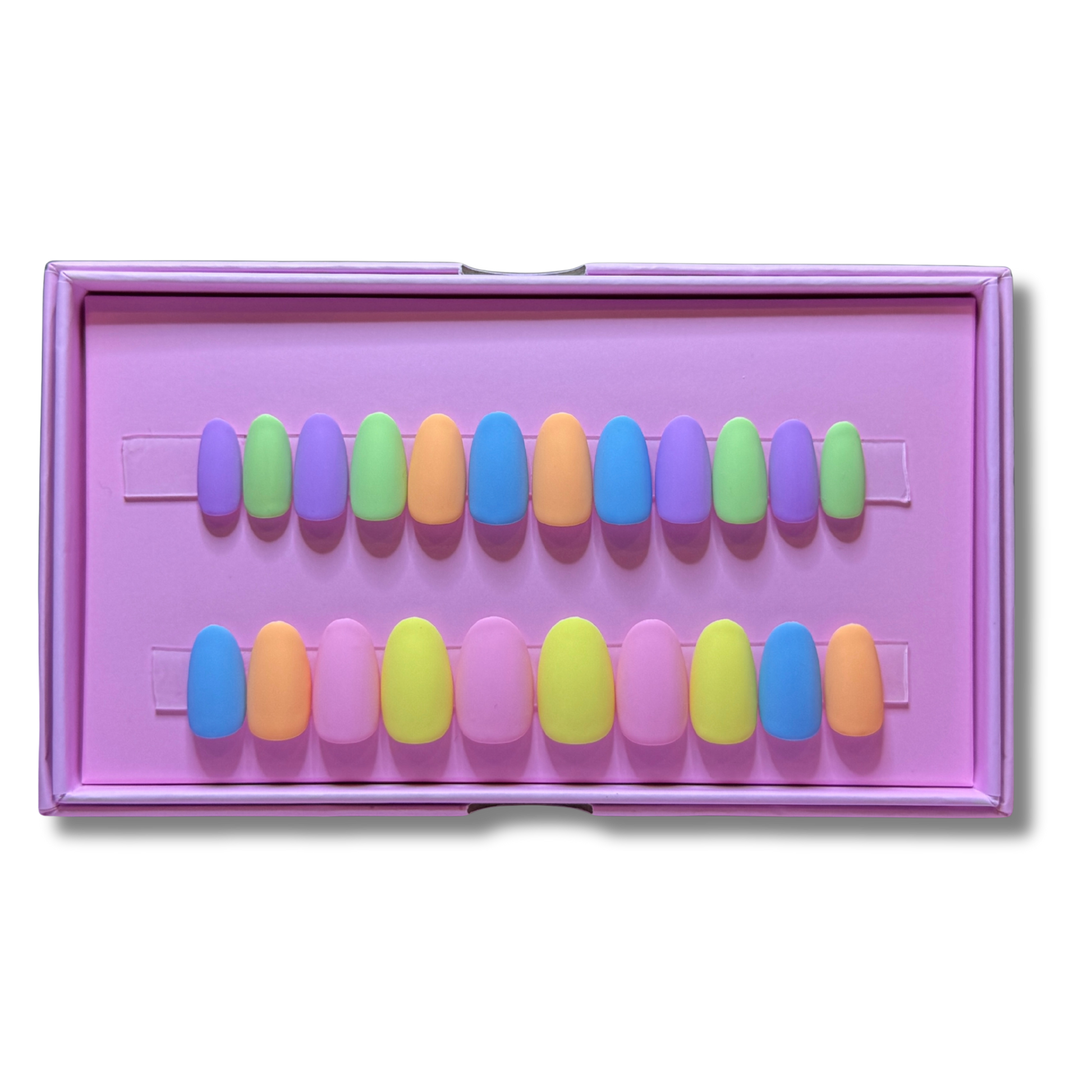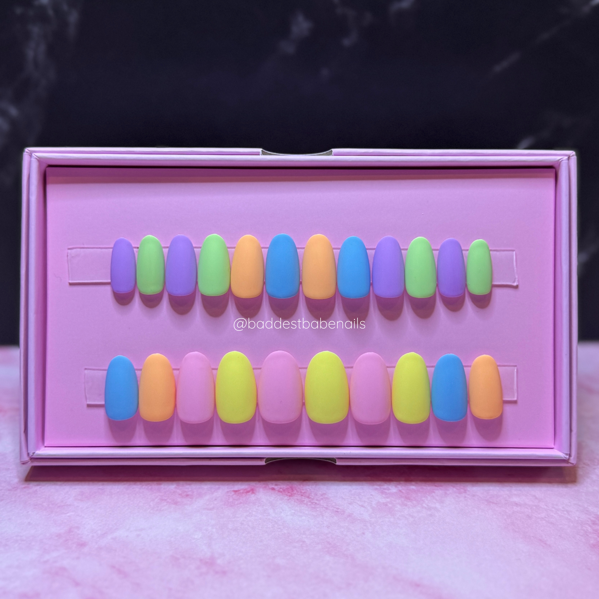 Ready to Wear Round/Short set in various neon pastel gel polishes.