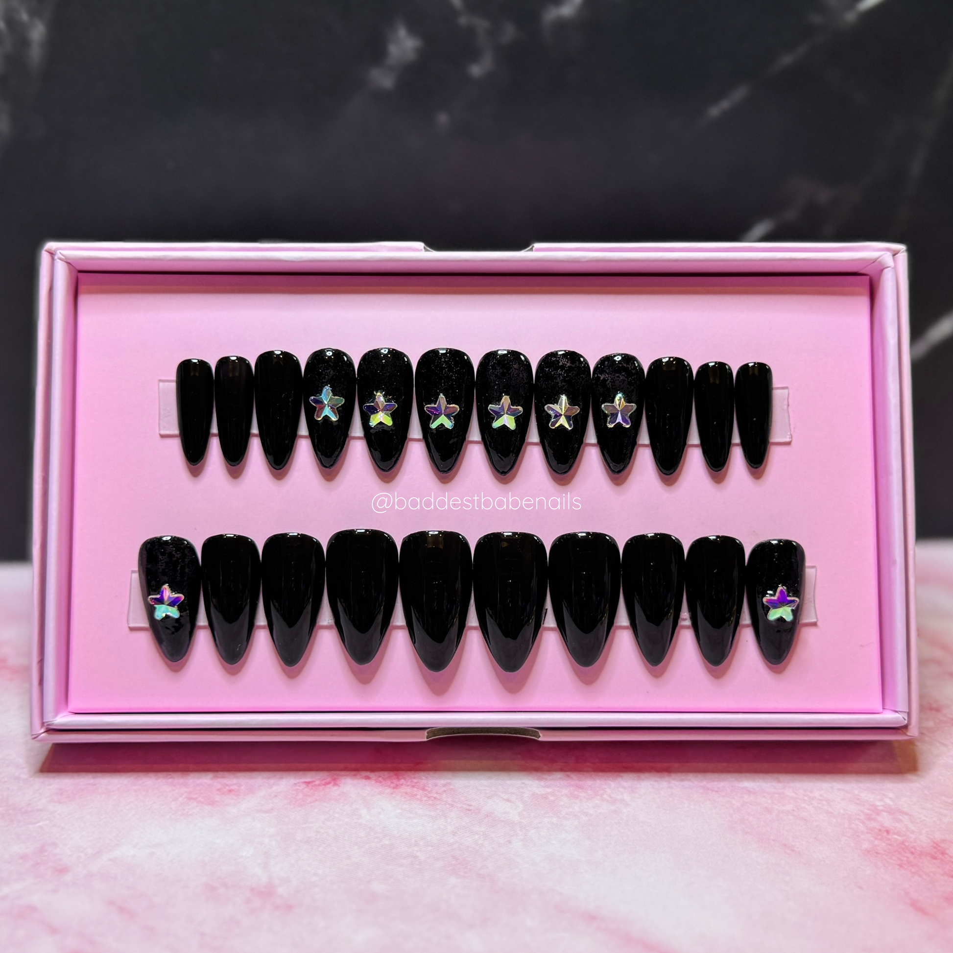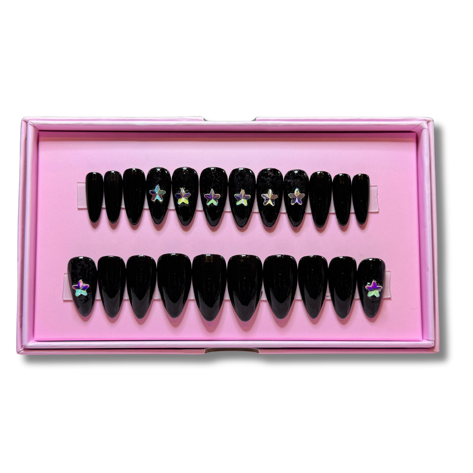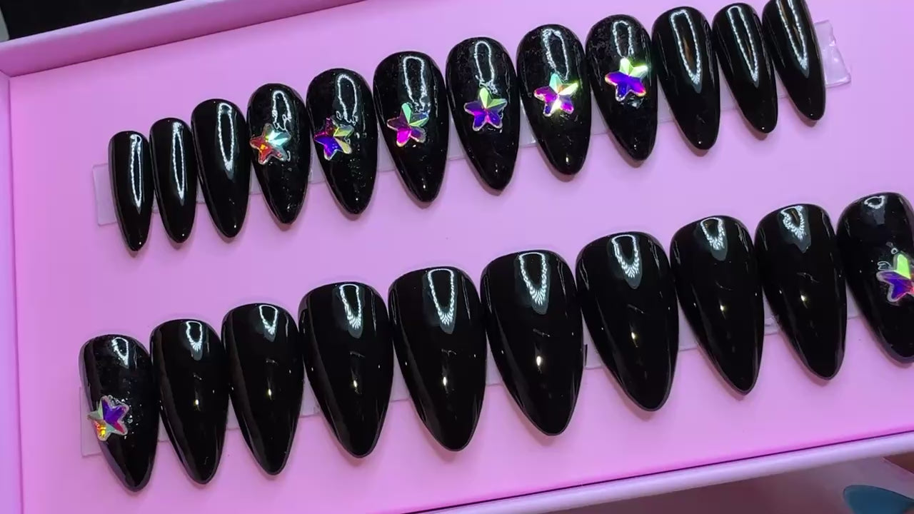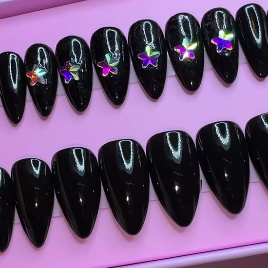 Ready to Wear Stiletto/Short set in black gel polish with black chunky glitter and star shaped rhinestones.