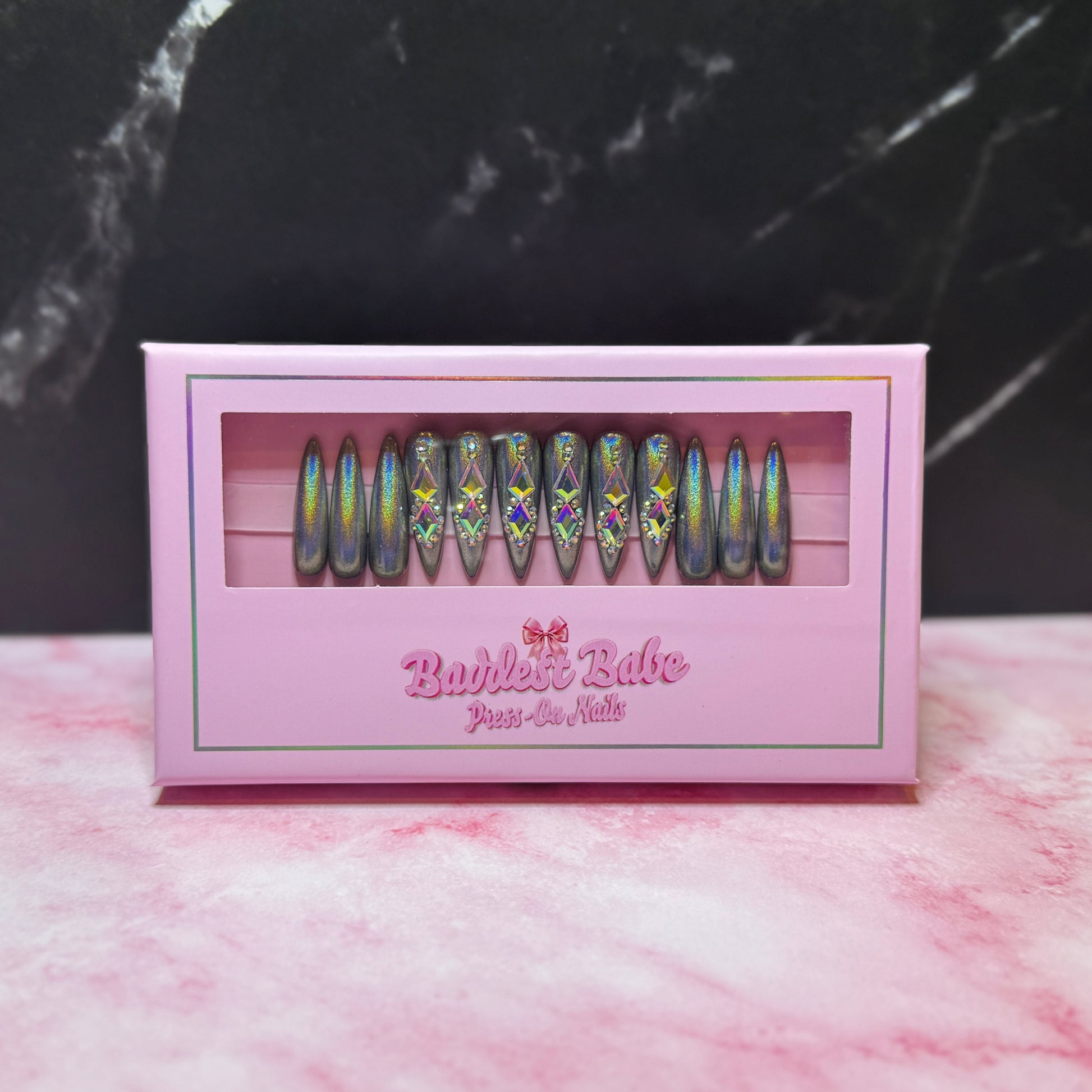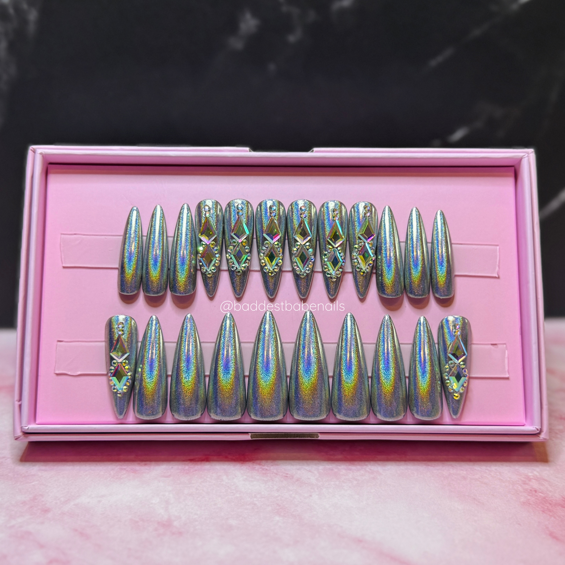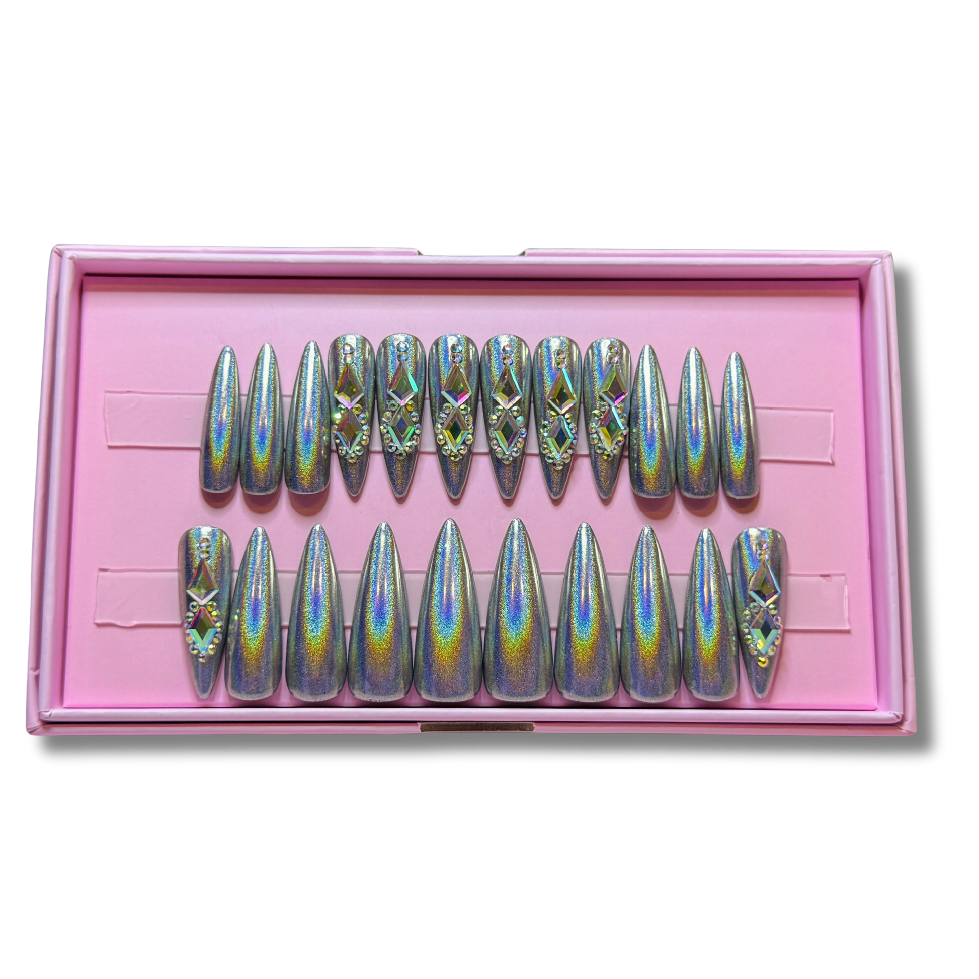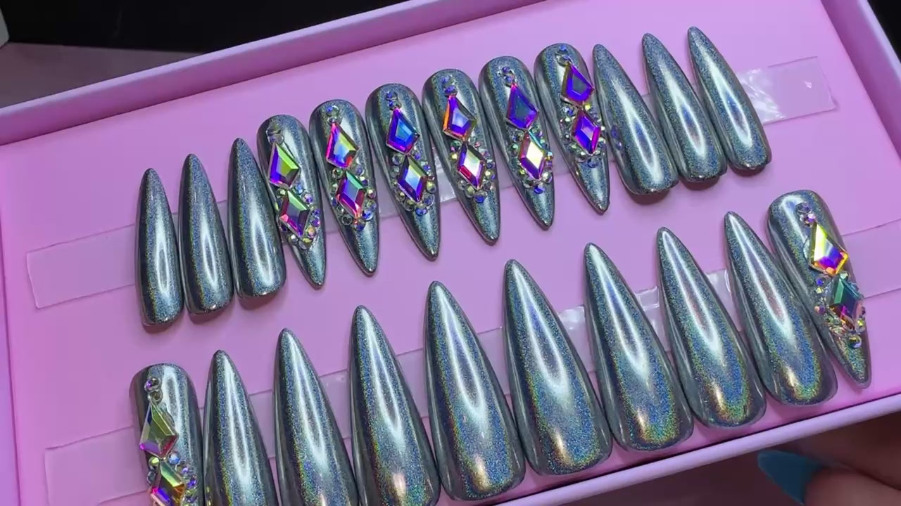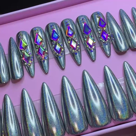 Ready to Wear Stiletto/Long set in a silver holographic chrome and AB rhinestones.